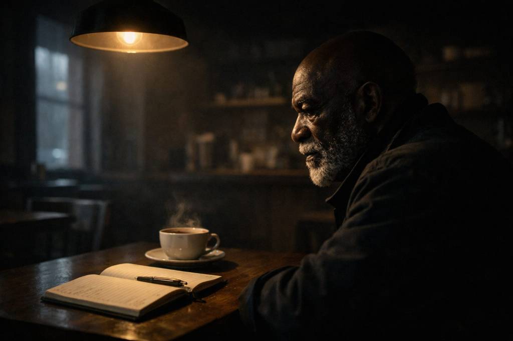 The café was nearly empty, the way it always was at that hour, when the city seemed to hold its breath between one intention and the next. A single bulb hung low over the table, casting a tired halo that didn’t quite reach the corners of the room. He sat beneath it with his shoulders rounded, as if the light itself carried weight, the familiar ache between his shoulder blades reminding him how many mornings had begun this way.