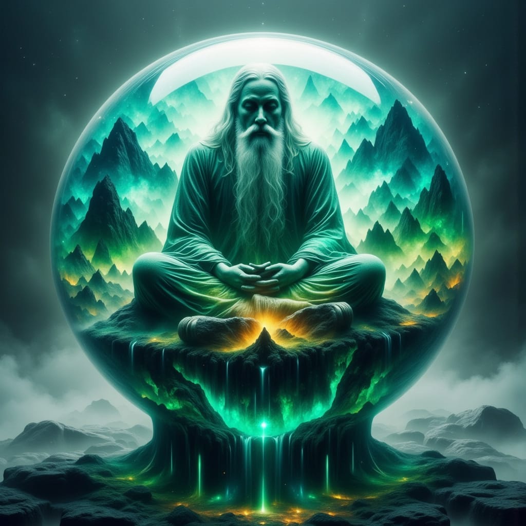 In the heart of the Hollow Mountains, where the air hummed with silence and time forgot to tick, a being older than wind sat. Encased in a sphere of shimmering energy—neither glass nor light, but something between—the Oracle meditated above a chasm that pulsed with ancient fire.