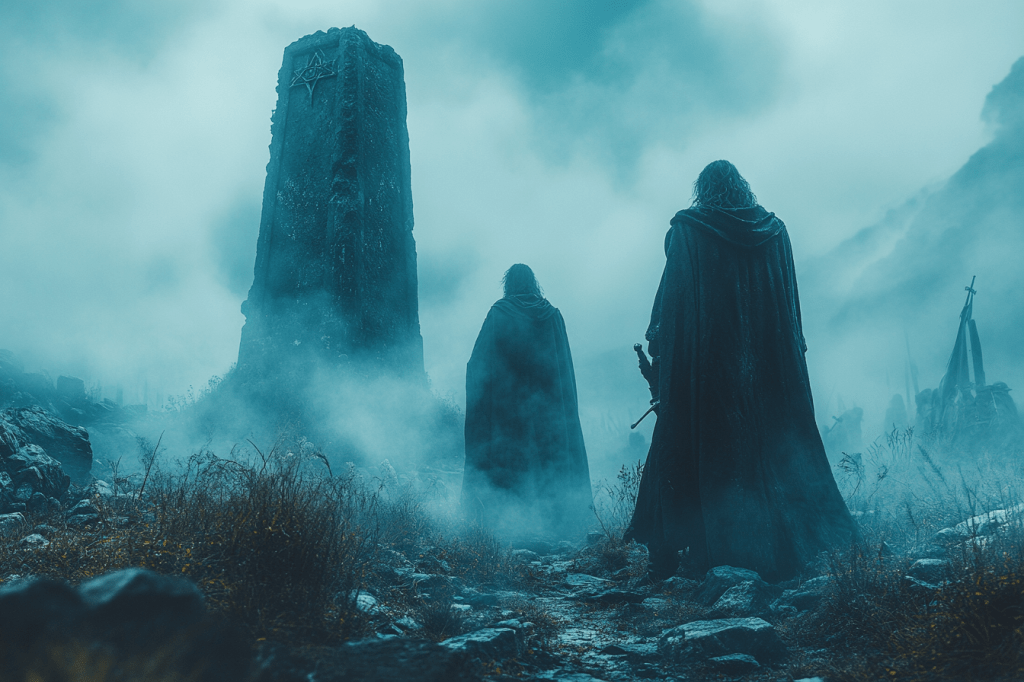 The mist clung to the earth like old sorrow, curling around boots and stones, swallowing sound. Two figures stood before the monolith, cloaked in black, their outlines blurred by fog and fate. The stone towered above them, carved from the mountain’s spine. Its surface was worn by centuries but still bore the mark—an eye within a jagged star—that pulsed faintly, like something alive and watching.