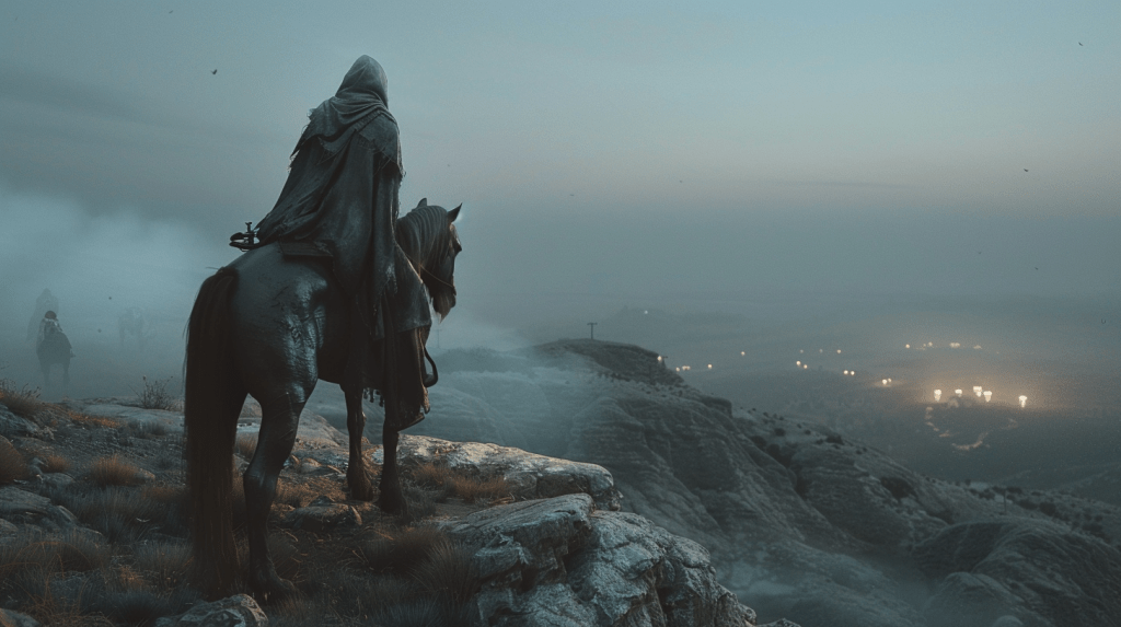 The saddle beneath me creaks as I shift, leather complaining in a language only the wind can answer. My limbs ache, not just from the vigil, but from something deeper—an unraveling. I am more wreck than man, hollowed by longing and the quiet violence of loss. My voice, once sure, now drifts somewhere in the ether, unreachable. Even if I could summon the will to speak, I no longer trust the shape of my own words.