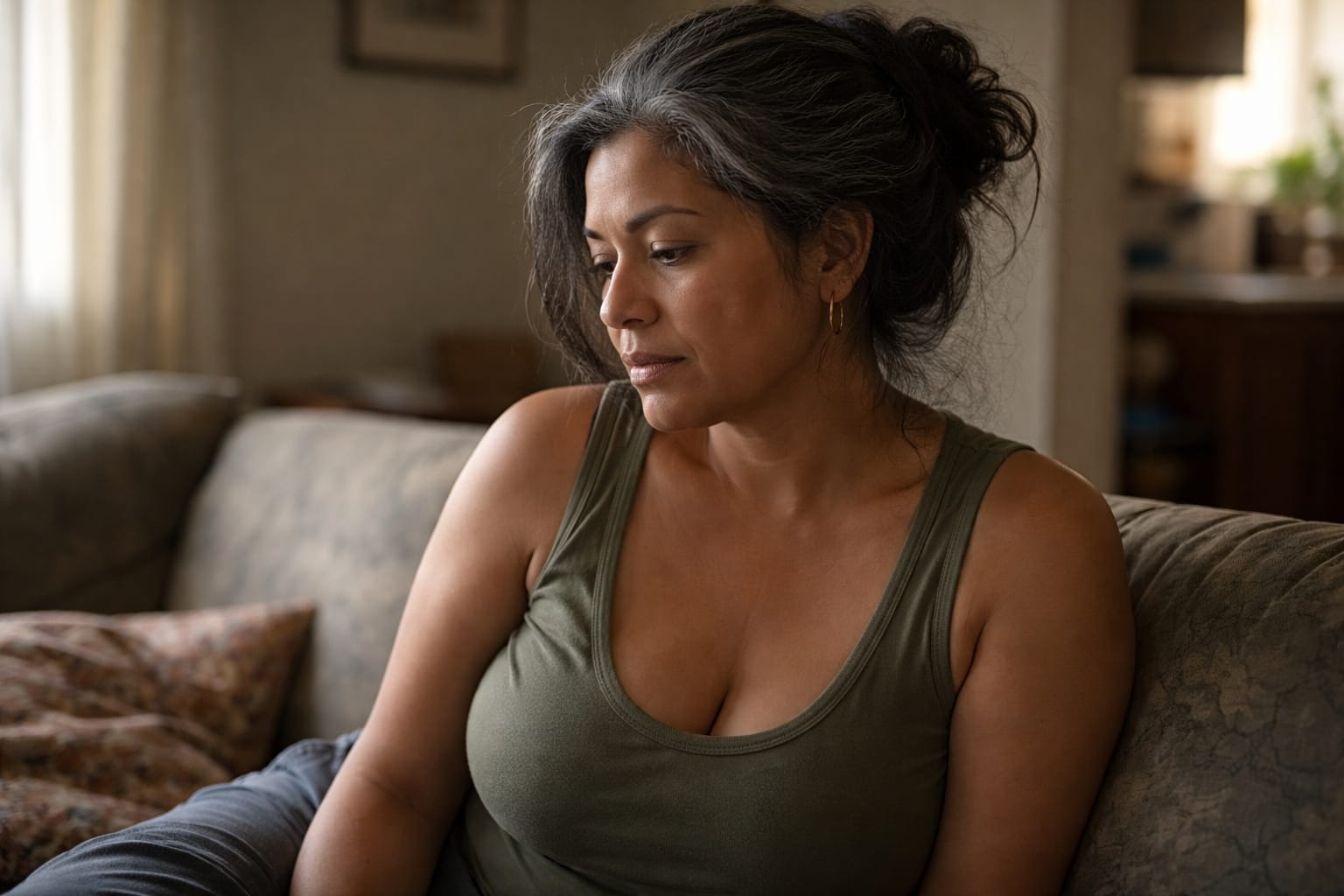 The couch gives beneath her, a slow surrender, fabric creasing where her body has learned to rest without asking permission. It remembers her shape better than most people ever have. Afternoon light slips in through the window—thin, dust-heavy, undecided—catching on the silver threaded through her hair, the soft pull of skin at her shoulders, the evidence of years spent carrying weight that never showed up on a scale.