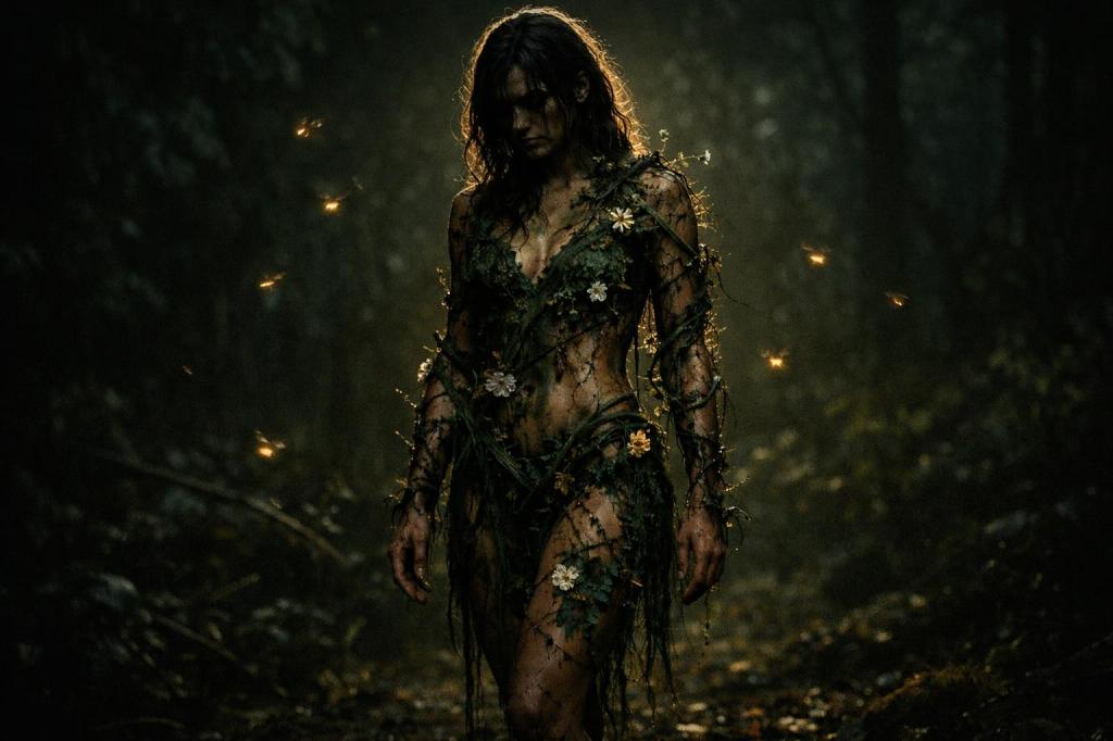 Ivy braided across her ribs. Pale blossoms trembled at her collarbone. Fine thorns traced her thighs like handwriting no one else could read. They tugged when she moved, gentle but present—reminding her that nothing beautiful grows without defense.