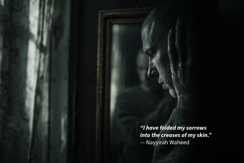 Waheed’s line understands that grief can become architecture. Not visible to everyone, but built into how you move, how you brace, how you rest.