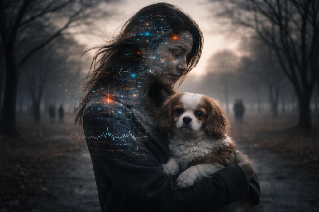 A woman standing in the mist, holding the dog. Dark coat. Head bowed. Hair moving in the wind like ink in water. There was something wrong with the light around her. It shimmered in blue and amber sparks, like circuitry trying to remember how to be stars.